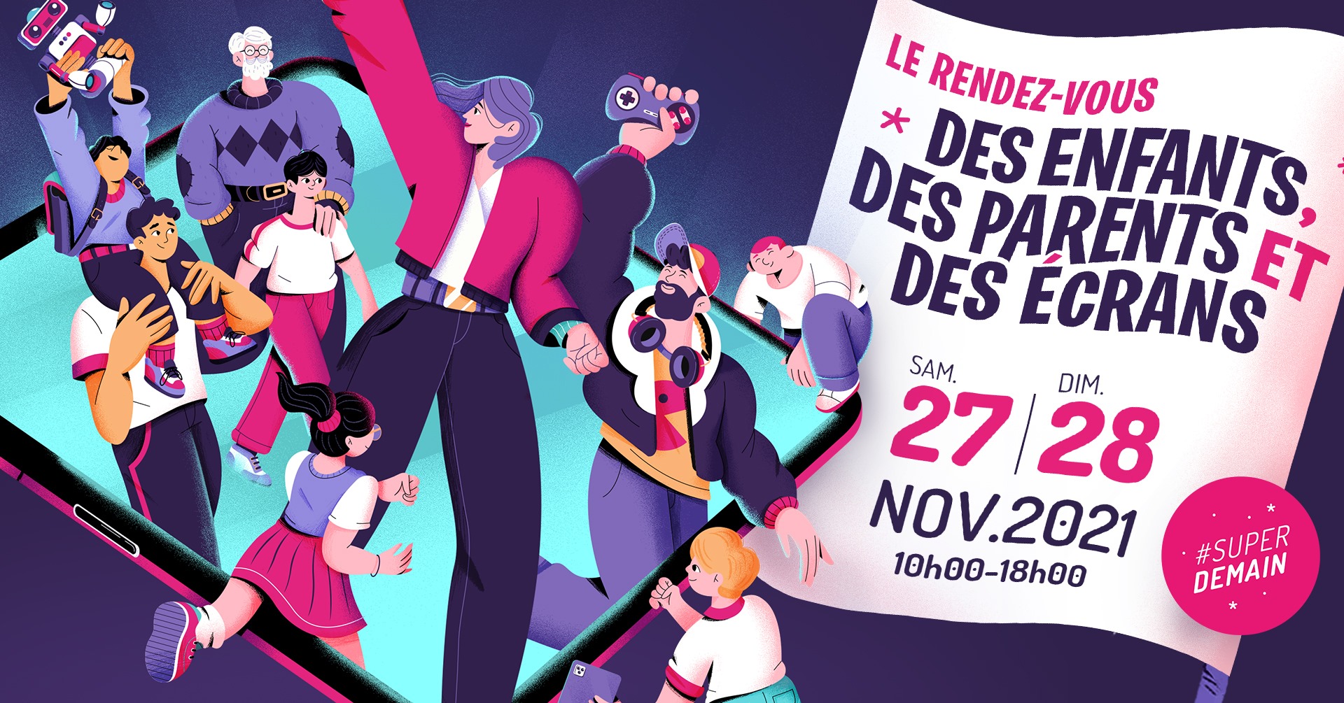 Pour sa 9e édition, l'évènement Super Demain débarque les 27 et 28 novembre à l'Hôtel de la Métropole ! Durant 2 jours, les parents, ados et enfants vont pouvoir expérimenter et échanger ensemble autour d'ateliers, d'expositions, de rencontres et de conférences sur nos pratiques quotidiennes liées aux écrans : jeux vidéos, web, réseaux sociaux, publicité, robots, médias.