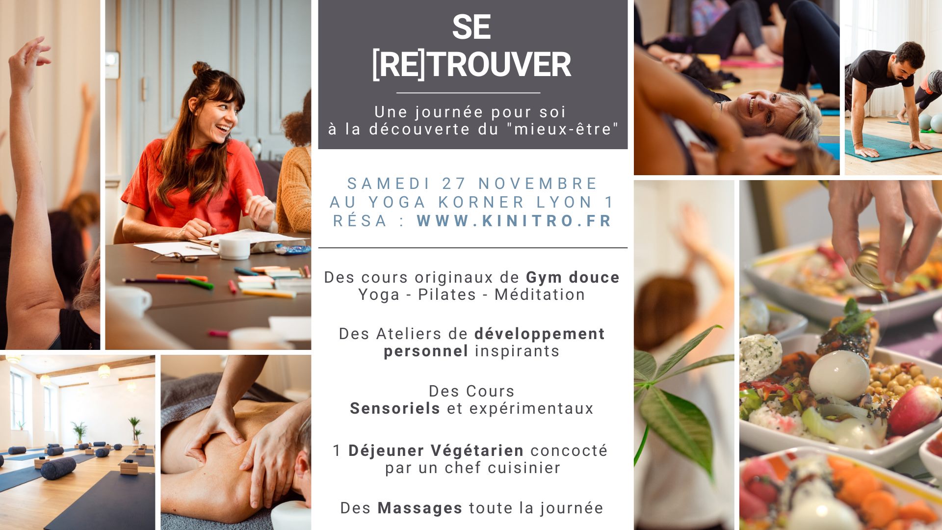 Ce samedi, Kinitro investit le Yoga Korner de 8h30 à 19h30 pour une journée inspirante à travers de nombreuses activités. Au menu : 7 cours de gym douce, 7 ateliers de développement personnel, 6 cours sensoriels, un chef engagé qui proposera un déjeuner végétarien et responsable et enfin un masseur professionnel. Le tout dans plusieurs pièces avec plusieurs ambiances.