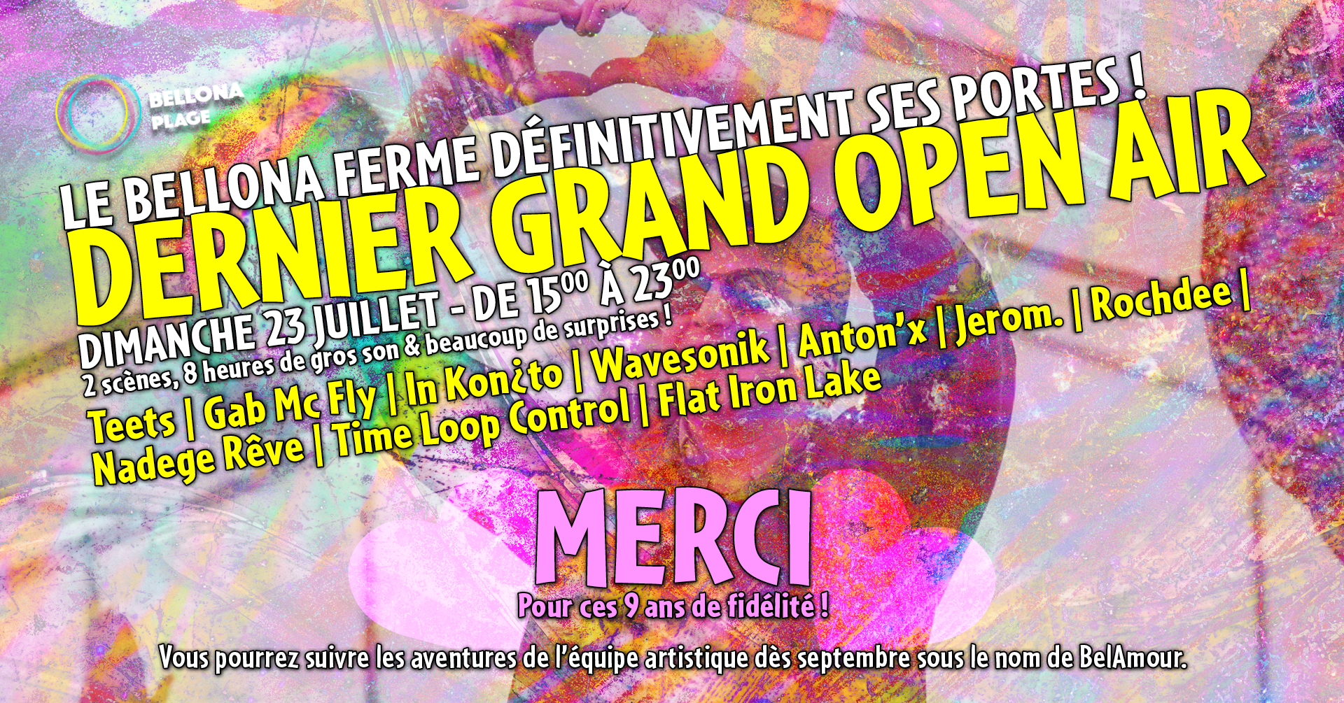Après 9 années de fête et de bonne humeur, le célèbre Bellona Club ferme ses portes ce dimanche. Pour l’occasion, trois énormes soirées avec des artistes différents sont organisées sur tout le week-end. L’ultime chance d’aller y enflammer le dancefloor avant la fermeture. Au programme : soirée « Lyon Is Burning » house to techno de 19h à 4h sur la plage et sous le chapiteau ce vendredi, soirée « La Parade » pour un open air XXL avec Deborah Aime La Bagarre qui débute dès 15h ce samedi avant de finir dimanche par un immense open air avec deux scènes et dix artistes de 15h jusqu’à 23h.