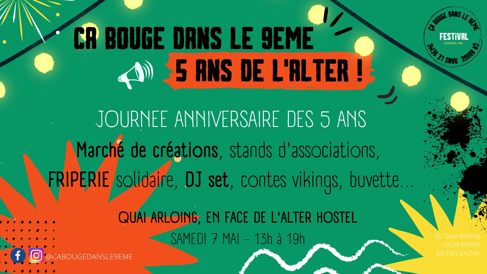 Pour clôturer le festival Ça bouge dans le 9e, l’Alter organise une après-midi anniversaire des 5 ans sur les quais de Saône ! Au menu : DJ set par DJ Goldi, contes vikings par la compagnie Graen Rot, marché de créateurs, ateliers et animations d’associations locales, friperie solidaire et même un concert de Fiesta Cubana à partir de 20h30 ! Ton samedi après-midi s’annonce on-ne-plus rempli…
