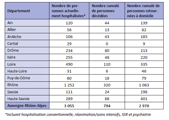 Commençons par un nouvel état des lieux : à l'heure où sont bouclées ces lignes, 3 055 patients atteints de COVID-19 sont hospitalisés en Auvergne-Rhône-Alpes (soit seulement 30 de plus que la veille) dont 671 en réanimation/soins intensifs (-3) selon l'Agence Régionale de la Santé. Au total, 794 décès dûs au Covid-19 ont été rapportés dans la région soit 21 de plus en 24h.