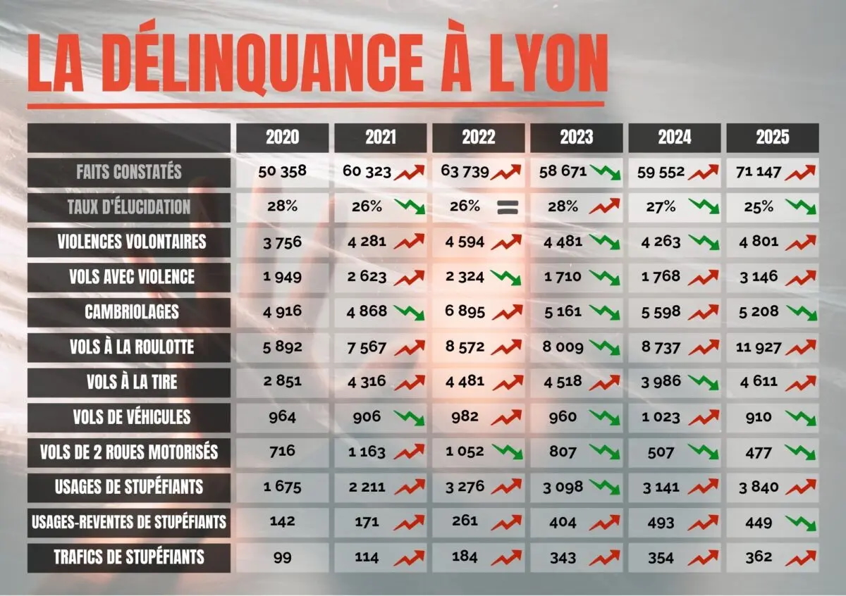 La délinquance à Lyon connaît une nette progression depuis le début des années 2020, avec un record atteint en 2025. Les statistiques montrent une augmentation significative des faits constatés intramuros : 60 323 en 2021 contre 71 147 en 2025. En seulement quatre ans, la hausse atteint 18 %, confirmant une tendance qui s’est accélérée sur la dernière année du mandat de l’actuel maire Grégory Doucet.