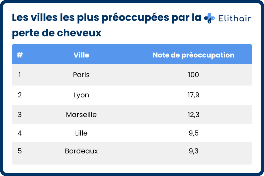 À l’échelle nationale, la perte de cheveux s’impose comme une inquiétude largement partagée. Avec plus de 60 000 recherches mensuelles autour des traitements capillaires, le sujet prend de l’ampleur. En tête du classement, Paris domine largement avec un score de 100, suivie par Lyon et Marseille. Derrière, Lille et Bordeaux complètent ce top 5 révélateur d’une tendance nationale.