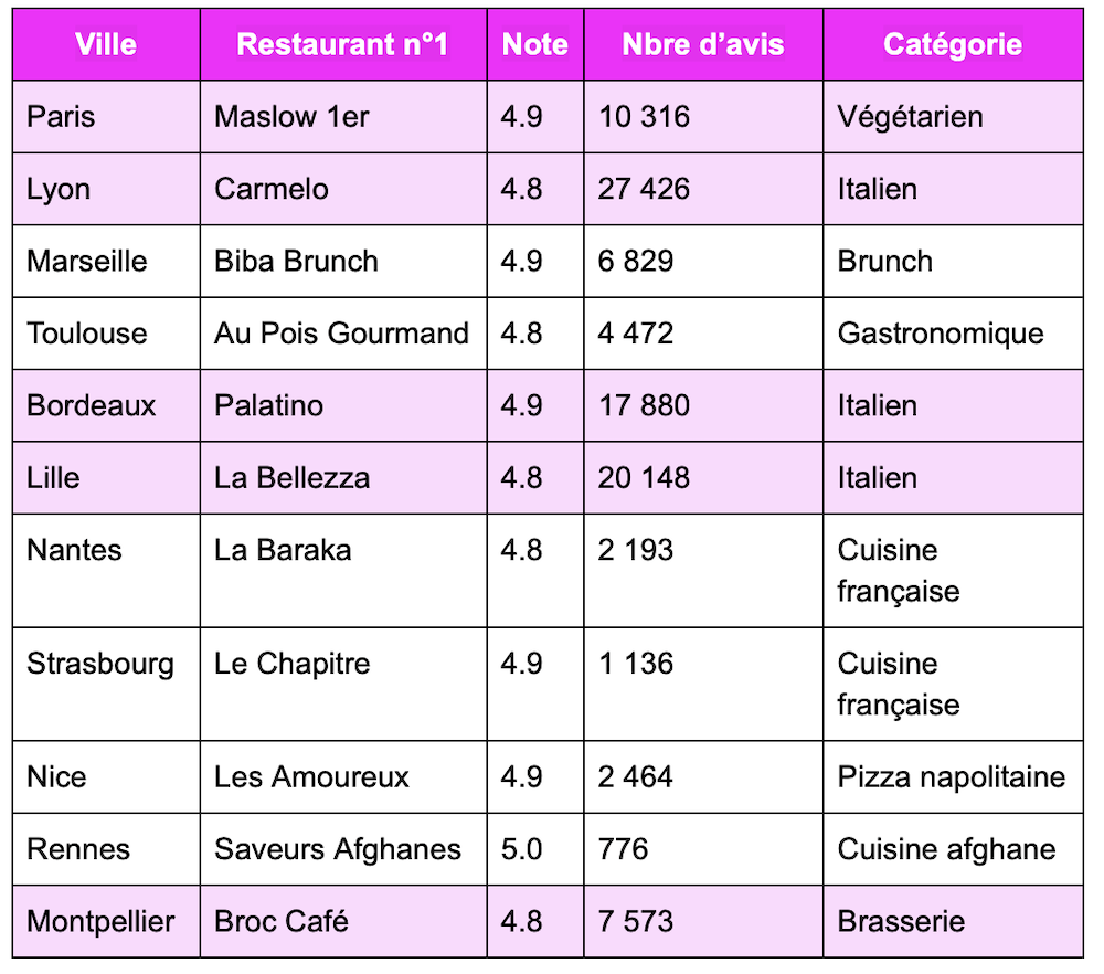 Dévoilé ce 22 juillet par sunday, acteur majeur du paiement digital dans la restauration, le palmarès Sunday Star 2025 s’appuie sur l’analyse fine des avis Google de plus de 100 000 restaurants répartis dans les 11 plus grandes métropoles françaises. L’algorithme propriétaire valorise les établissements avec une note moyenne élevée, pondérée par le volume d’avis. Aussi, avec près de 7 000 avis et une moyenne exceptionnelle de 4,9, le restaurant marseillais Biba Brunch figure dans le Top 10 des restaurants les mieux notés de France, se hissant aux côtés des plus grandes maisons de Lyon et Paris.