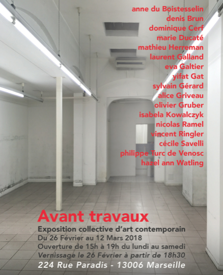 Avant travaux, c'est le nom donné à cette exposition organisée par Olivier Gruber et qui met en avant des artistes contemporains de la région dans un lieu "éphémère" destiné à être vendu. Les artistes : Anne Du Boistesselin, Denis Brun, Dominique Cerf, Marie Ducaté, Mathieu Herreman, Laurent Galland, Eva Galtier, Yfat Gat, Sylvain Gérard, Alice Griveau, Olivier Gruber, Isabela Kowalczyk, Nicolas Ramel, Vincent Ringler, Cécile Savelli, Philippe Turc de Vanosc, Hazel Ann Watling.