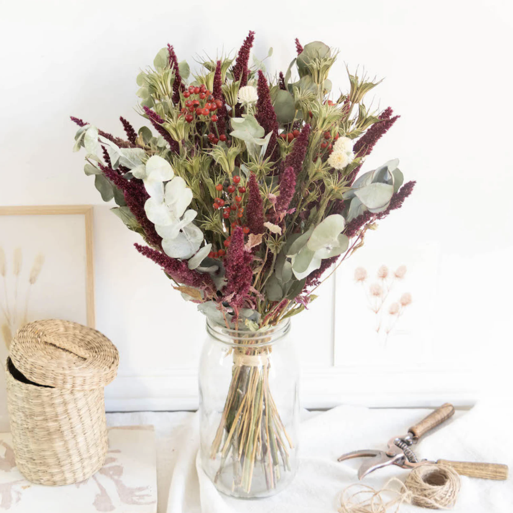 Loin des pots-pourris d'antan, les bouquets de fleurs séchées reviennent en force dans nos maisons et appartements. Idéal pour donner une note colorée à son intérieur sans s'en préoccuper, le bouquet de fleurs séchées est un bon compromis déco. Notre coeur vibre pour le bouquet Helsinki qui se démarque du reste des bouquets par sa couleur bordeaux assez singulière.