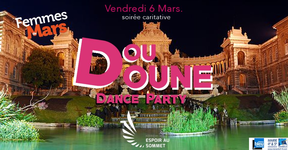 Femme de Mars et la Mairie du 4e et 5e arrondissements, vous ouvrent les portes d'un lieu mythique de Marseille : Le Palais Longchamp. Rendez-vous entre les célèbres fontaines de Lonchamp, transformé en dancefloor éphémère le temps d'une soirée. Au programme : musique, danse et tempête de neige avec Swakky aux platines. La totalité de la billetterie sera reversée à l'Association Espoir au Sommet au profit de la lutte contre le cancer.