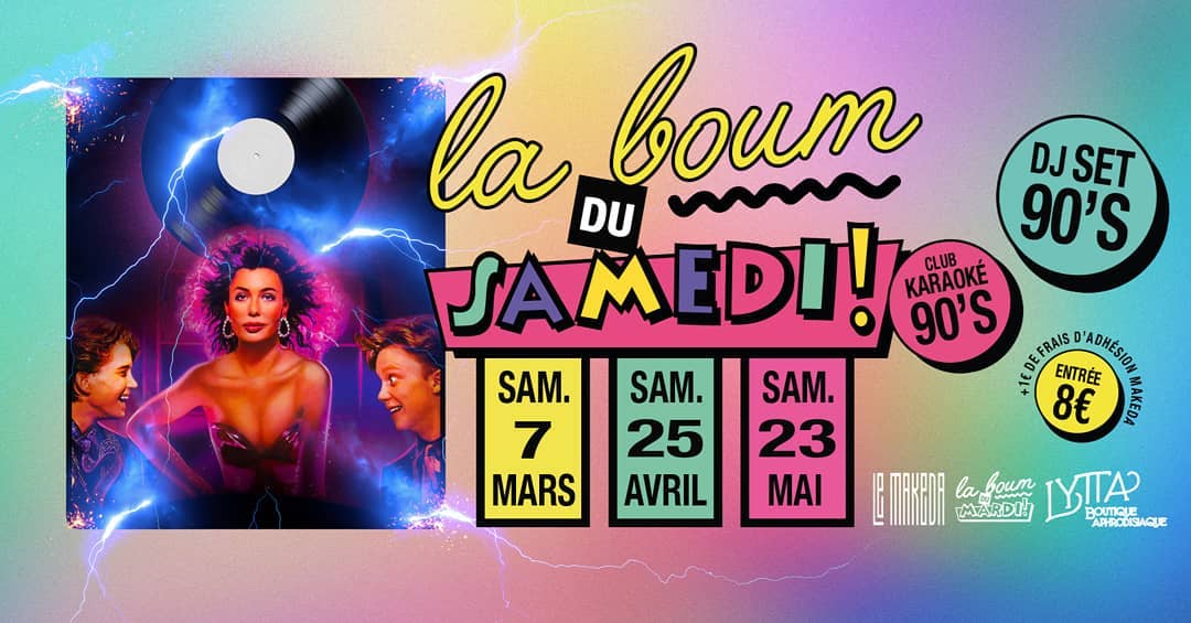 Retrouvez toute l'équipe de la Boum du samedi, une fois par mois au Makeda. La Boum c’est des paillettes, un karaoké, une djette, des gens stylés comme dans les années 90, des meufs fraiches et des mecs pas jaloux. On y chante (beaucoup, très fort et très mal), on y danse sur une playlist hip-hop, rock, pop spéciale années 90 only, on y rit et on rencontre que des gens "fun et cool" !