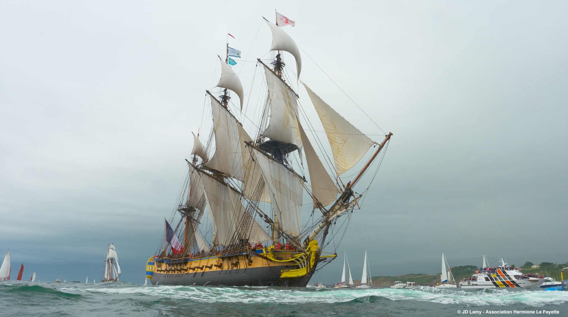 Sous l’impulsion de l’Association Hermione-La Fayette (créée en 1992), une réplique de L’Hermione de 1779 voit le jour à partir de 1997. Et tout y est : les 32 canons à boulets, le mât de 54 mètres et quelques 2 200 m2 de voilure.