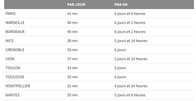 L'an dernier, l’automobiliste Marseillais a perdu environ 146 heures, bloqué dans les bouchons. Traffic Index, qui publiait cette information mardi dernier, se penche sur des bases de données visibles grâce à la géolocalisation des véhicules. Plus de 550 millions de sources alimentent leur service d’information en temps réel. Chaque jour, le Marseillais perdrait 40 min par jour dans les bouchons (à raison de 20 le matin, et 20 le soir).