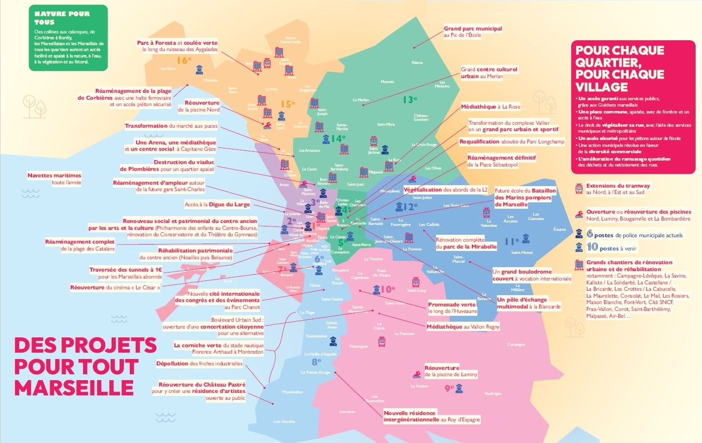 Côté équipements, la Ville mise sur des projets marquants comme un grand parc dans le massif de l’Étoile avec ferme pédagogique, une pinède le long du Prado jusqu’à la Pointe Rouge, ou encore le plus grand boulodrome couvert du monde à Saint-Marcel. Sans oublier des mesures très concrètes pour le quotidien : cantine gratuite pour 15 000 enfants, création de 100 rues apaisées autour des écoles, ou encore mutuelle municipale accessible à tous. Une vision globale qui cherche à rendre Marseille plus agréable, plus verte et plus inclusive.