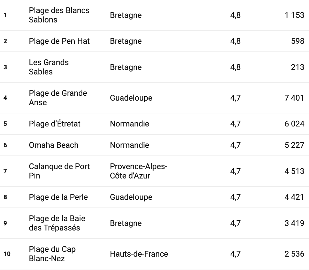 Le haut du classement est largement dominé par la Bretagne, qui s’offre un triplé avec les plages des Blancs Sablons, Pen Hat et les Grands Sables. Figurent également dans le top 10 des plages de Guadeloupe, Normandie, et une plage des Hauts-de-France. Dans une étude où les écarts se jouent parfois à quelques centièmes de point, il faut saluer la présence de nos 3 plages marseillaises dans ce classement qui confirme l’attrait des criques méditerranéennes et la force du patrimoine naturel marseillais.