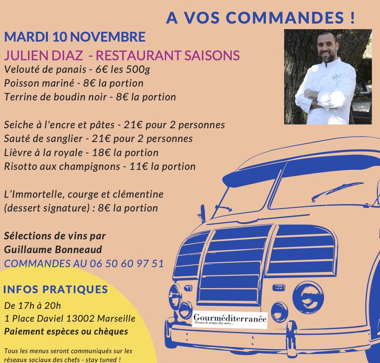 En ces temps compliqués où notamment les métiers de passion comme la restaurant tirent la langue, les chefs de gourméditerranée ont décidé d’agir. Pour vous offrir un confinement gourmand 8 grands chefs marseillais investissent le camion de Fabien Rugi le temps d’un soir. Tour à tour les chefs vont se succéder dans cette installation d’un nouveau genre pour faire ce qu’ils font de mieux : vous éblouir de leurs talents culinaires.