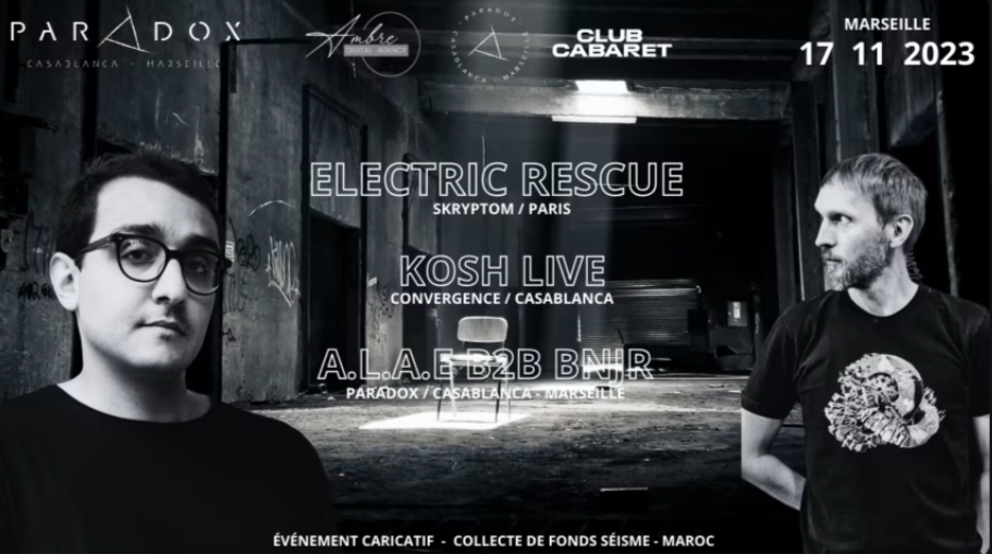 Ce soir le Cabaret Aléatoire fera trembler les murs et dédié au séisme survenu dans le sud du Maroc. Pour l’occasion les fonds collectés seront reversés aux associations de la région touchée par cette catastrophe naturelle. Qui de mieux pour incarner cette causse qu’une Line up 100% marocaine ? Alors pour ceux à la recherche d’une rave techno all night long et soutenir à la fois le Maroc c’est au Cabaret Aléatoire que ça se passe ! Un mélange de techno endiablée et mélodies enivrantes pour nous rappeler les subtilités des traditions musicales marocaines…