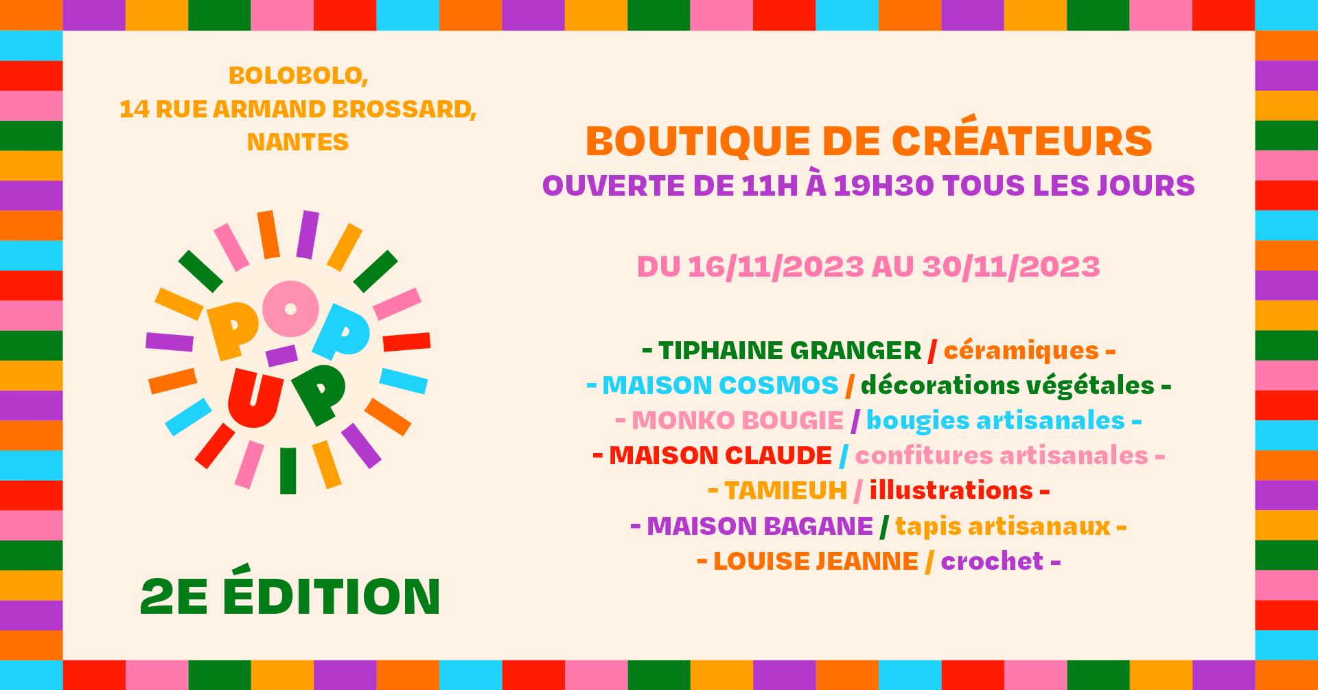 Du 17 au 30 novembre, 7 créatrices et créateurs de la région prennent possession du pop-up store Bolobolo pour vous proposer des créations originales et faites main, entièrement made in France. Au programme : céramique, illustrations, bougies, décorations végétales, tapis, crochet et même confitures. Autant dire que les pépites vont s’accumuler pour vous permettre de vous faire plaisir ou de dénicher vos premiers cadeaux de Noël à la sauce locale et française. Elle est pas belle la vie ?!