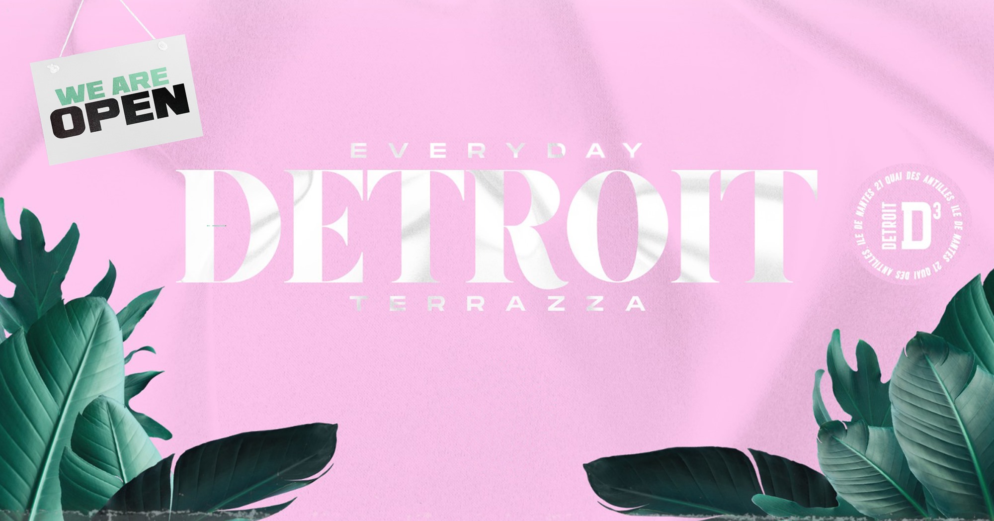 Le D3 en version estivale, c'est DETROIT TERRAZZA vous accueille le lundi (17h - 00h), vendredi (17h - 02h), samedi (16h - 02h), et dimanche (15h - minuit) sur sa terrasse aménagée et dans son patio convivial sur les bords de Loire. Tout ça animé par des DJ sets de Toolate and friends, et avec un pop up store Eden Garden Avocado Restaurant pour les gourmands.