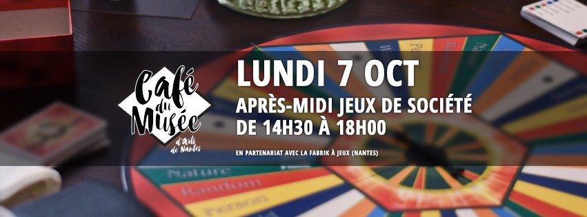 Tous les 1ers et 3èmes lundis de chaque mois de 14h30 à 18h, le Café du Musée d'arts de Nantes vous propose ses après-midi « bar à jeux », en partenariat avec « La Fabrik à Jeux » qui propose à chaque fois une nouvelle sélection de jeux. Vous pourrez y découvrir gratuitement de nouveaux jeux de société, passer de bons moments entre amis ou en famille, rencontrer du monde, tout en grignotant une douceur ou buvant un verre.