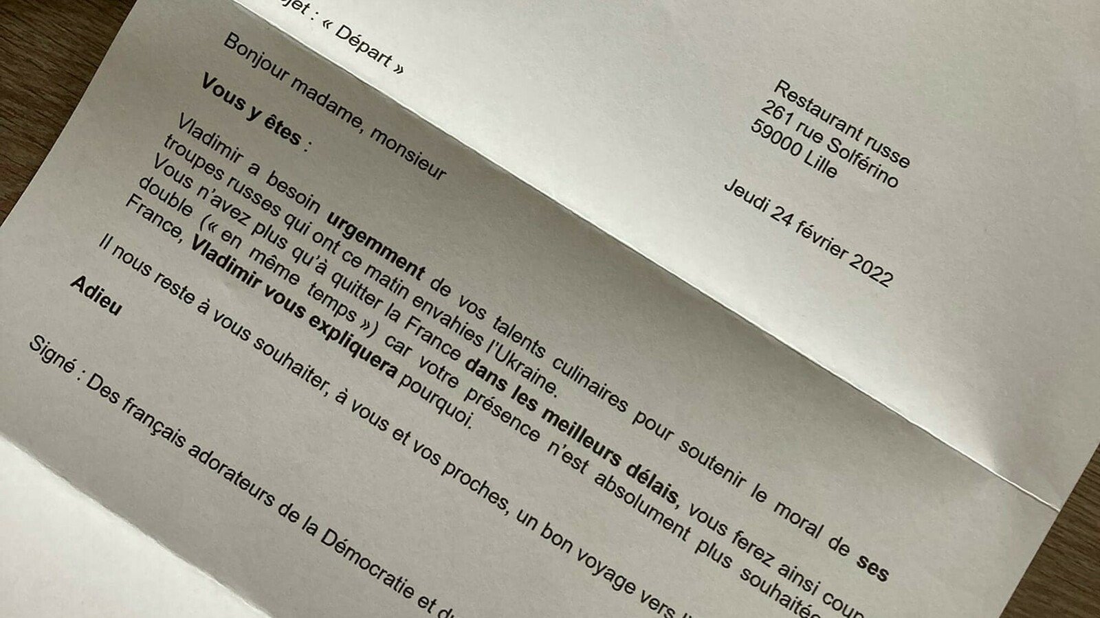"Vladimir a besoin urgemment de vos talents culinaires pour soutenir le moral de ses troupes. Vous n’avez plus qu’à quitter la France dans les meilleurs délais, car votre présence n’est absolument plus souhaitée", peut-on lire dans cette lettre. L'objet de la lettre est d'ailleurs "Départ". D'après les informations du Progrès, la propriétaire du Roi Alexandre, Diana, aurait également reçu deux appels en numéros masqués, avec un premier avertissement, puis une menace de mort si elle ne quittait pas la France.