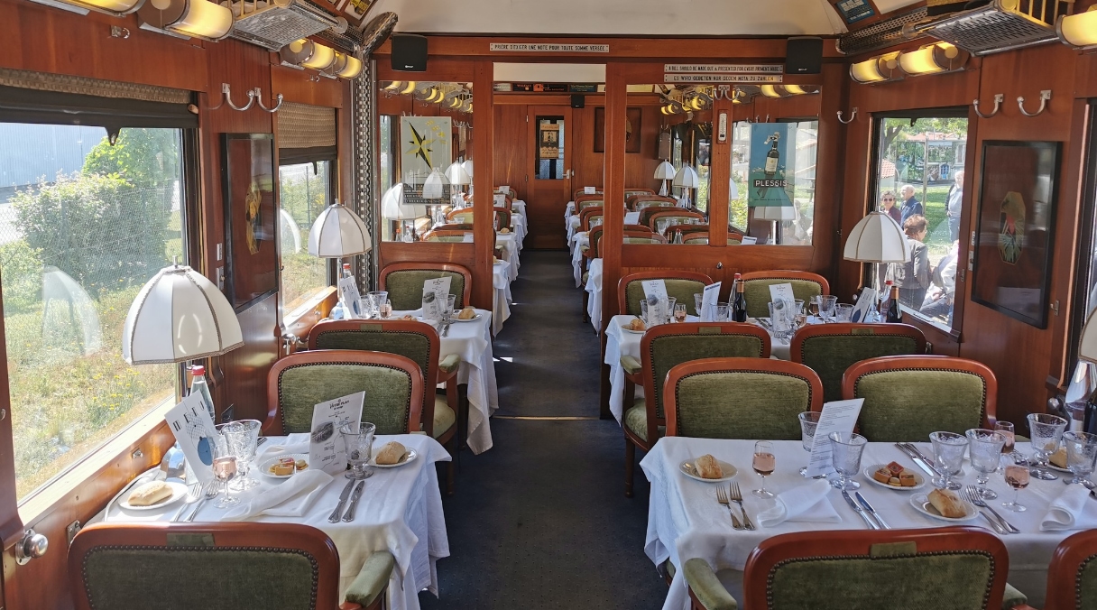 Vous embarquez à bord de véritables voitures-restaurants d’époque, soigneusement restaurées. Parmi elles, on retrouve notamment des wagons emblématiques comme la voiture n°2750, construite en Italie en 1926, ou encore la voiture n°4216, fabriquée en Belgique en 1940. À l’intérieur, tout a été pensé pour recréer l’atmosphère des grands trains de luxe : boiseries élégantes, détails raffinés, tables dressées avec soin… Le décor vous plonge immédiatement dans une autre époque. Le temps d’un repas ou d’une balade, vous découvrez le mythique art de vivre des Grands Express européens.