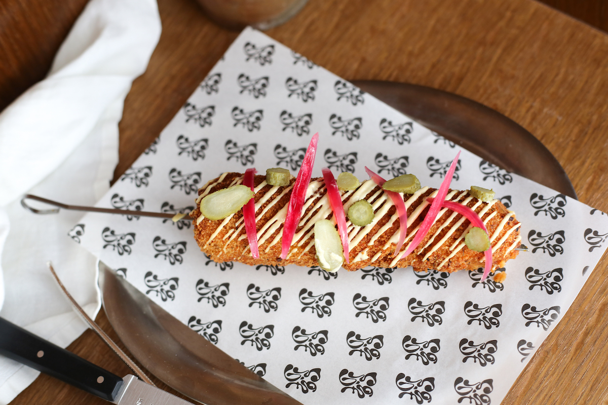 Au programme donc, on retrouve ce qui a fait le succès de la première adresse — qui ne désemplit pas. Pas de sandwichs ou sundaes à emporter ici, mais une identité fancy et une cuisine élaborée dans un lieu vibrant, mi-canaille, mi-bourgeois, mais bougrement actuel. Une cuisine de sauces et foncièrement végétale où savoir-faire, durabilité et éthique sont réunis, et forcément, des saveurs inégalées : guacamole de brocoli, pickles de piment doux, zestes, basilic et cébette ; croquettes cochonnes avec une farce maison aux champignons et pâte de soja fumée, délicate gelée, fine panure croustillante et sauce ravigote liée ; ou encore jus de carcasses de légumes décliné selon les saisons et cuisiné à base de légumes rôtis, réduits, puis filtrés pour obtenir un jus sapide et corsé. Avec l'option à la carte ou le menu expérience (compte une cinquantaine d'euros), à accompagner de quilles bien choisies. On t’avait prévenu.