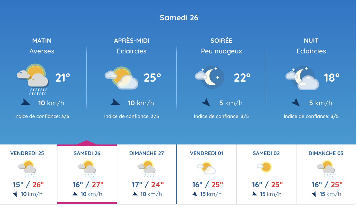 Vendredi signe le léger mieux de la semaine : quelques éclaircies entre deux passages nuageux et des températures enfin agréables (jusqu’à 24 °C). Samedi reste doux et partiellement ensoleillé, entre 16 et 27 °C. Une météo idéale pour les marchés, les parcs ou les cafés en terrasse. Dimanche, en revanche, les nuages pourraient reprendre du terrain, avec de possibles ondées en seconde partie de journée.
