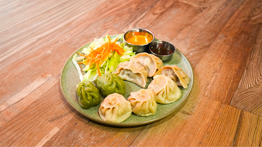 Dans la décoration assez épurée, on retrouve ici et là des touches qui nous transportent directement de l’autre côté de la planète. Sculptures traditionnelles, photographies au mur, ou encore des livres pour en apprendre plus sur ce pays. Mais attention, si ici, ce sont les momo, des raviolis typiques des rues de Katmandou, qui sont à l’honneur, Soni, propriétaire et styliste, nous propose un véritable tour du monde gastronomique. Car si le Toit du monde s’invite des entrées aux desserts, il mêle aussi ses épices aux saveurs de pays voisins, ou un peu plus lointains. Si les momo, tous faits maison, sont disponibles dans des formules « classiques », ils se déclinent aussi à la sauce butter chicken, tandoori, alfredo ou même pesto. L’idée est simple, rendre la cuisine népalaise accessible, et surtout rassembler les gens et les cultures du monde