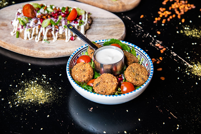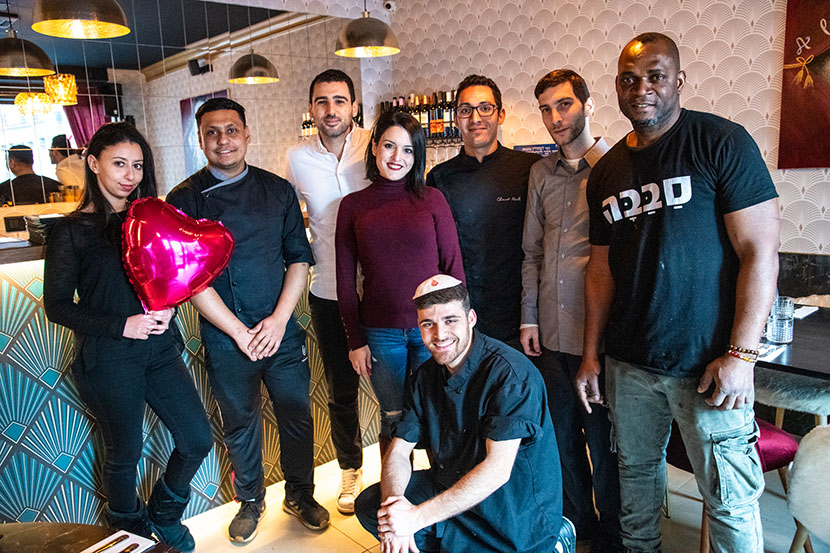 Côté entrées, baba ganoush, houmous bassar ou shakchuka nous projettent directement dans les allées du shouk Hacarmel, célèbre marché israélien. Si ces mises en bouche sont toutes typiquement israéliennes, les plats, eux, sont le fruit d’un heureux mariage France/Moyen-Orient, comme l’entrecôte assaisonnée au zaatar ou la mayonnaise agrémentée à la amba (épice irakienne). Les véganes, eux, trouvent leur bonheur parmi la multitude de tapas proposées, entre aubergine fumée, patate douce rôtie ou massabaha, ils ne sauront plus où donner de la tête.