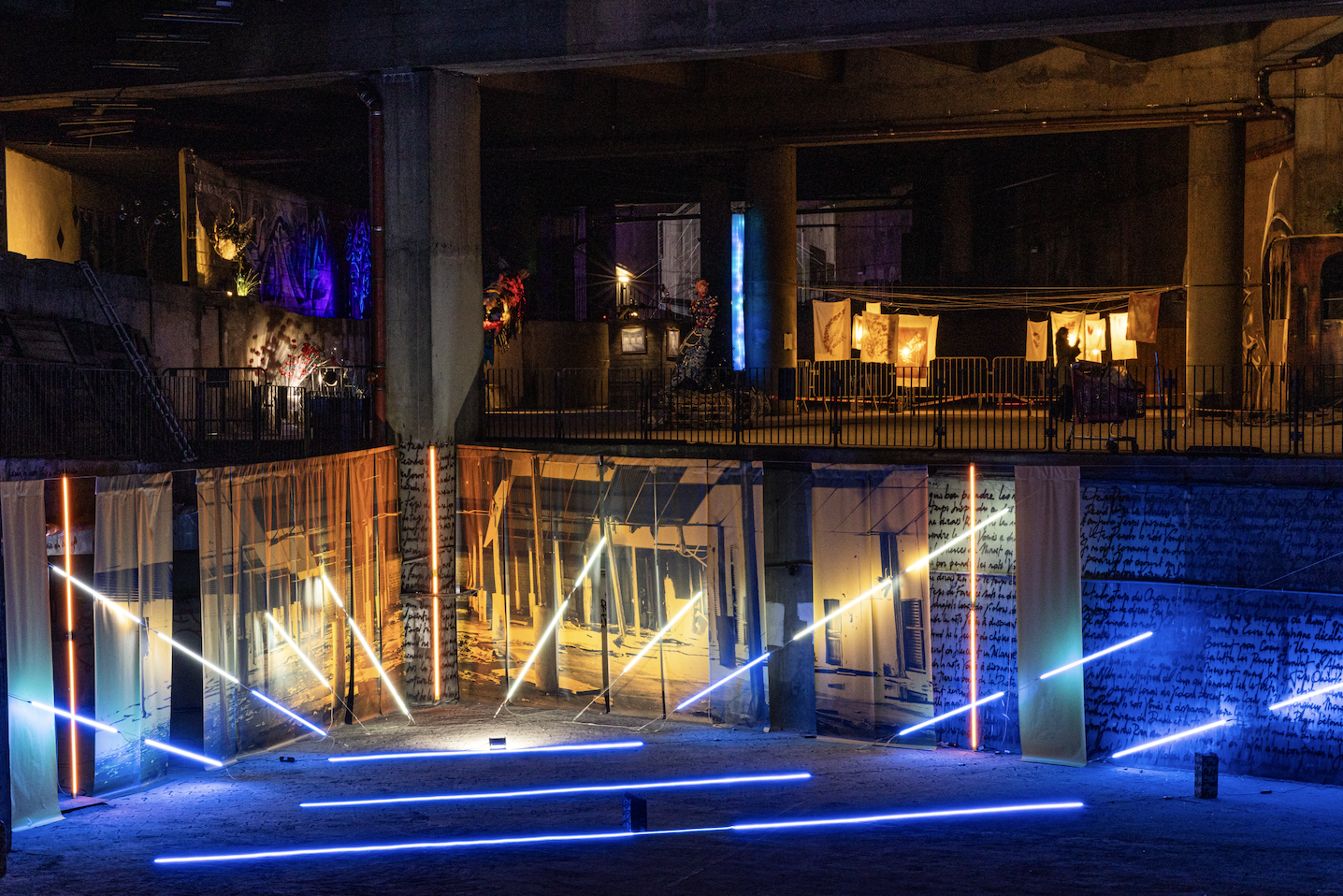 Au fur et à mesure de la visite, véritable exploration, on se rend compte de la taille impressionnante de l’endroit, qui se dévoile petit à petit. Et tout au bout de cette cathédrale de ciment, après avoir étudié l’art-déchet et les impressions à la rouille, découvrez nos deux créations coups de cœur : une sculpture de vide, réalisée à l’aide d'élastiques fluorescent, où l’anamorphose se fait reine pour jouer avec nos perceptions ; et une création onirique, où des jets de bruine donnent vie à des formes géométriques hypnotiques. À voir absolument.