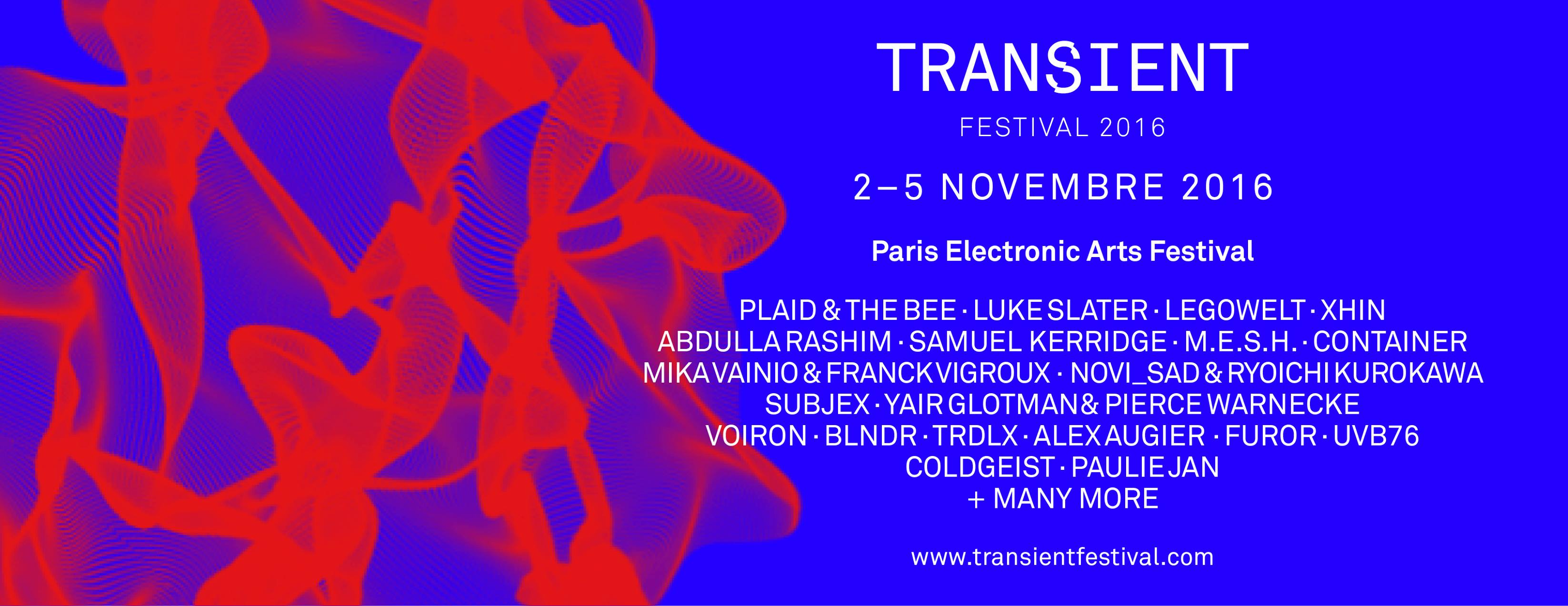 Du 2 au 5 novembre, Paris sera la capitale des arts numériques. Pour sa troisième année, le Transient Festival, nous immergera dans les arts numériques sous toutes leurs formes. Des styles musicaux avec l’electronica, la techno, l’ambient ou l’électroacoustique ainsi que des pratiques artistiques liées au numérique comme le net art, le video mapping, le glitch art, la video modulaire, le web-jaying mais aussi l’art plastique et la performance théâtrale.