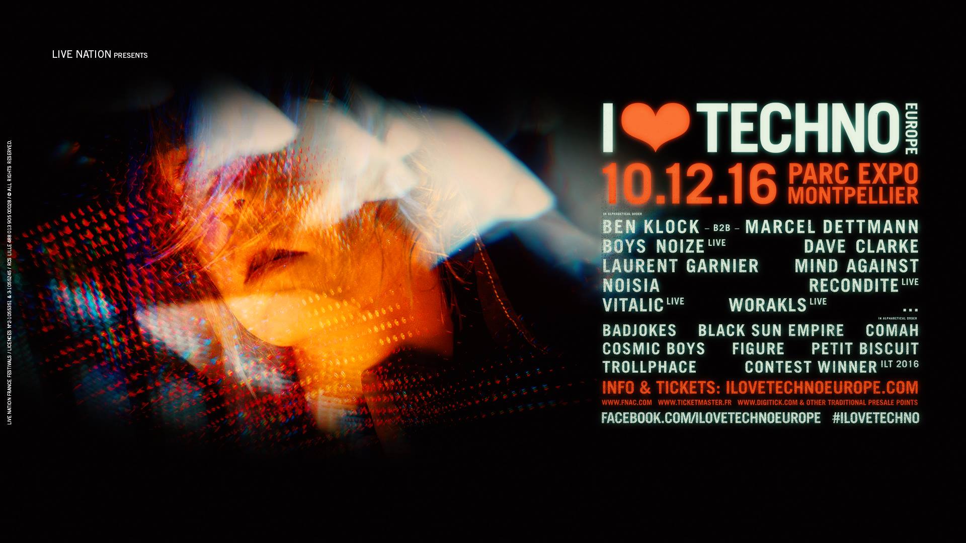Ce week-end du 10 décembre, pas de question à se poser, on prend la route de Montpellier. Une vingtaine des plus grands DJs de la scène mondiale et européenne s’y donnent rendez-vous pour le plus grand bonheur des amateurs des musiques électroniques. Au programme de cette 6ème édition d’I Love Techno en France, une nuit entière de Lives et DJ sets intenses avec : Ben Klock b2b MARCEL DETTMANN, Boys Noize (live), Dave Clarke, Laurent Garnier, Mind Against, Recondite (live)...