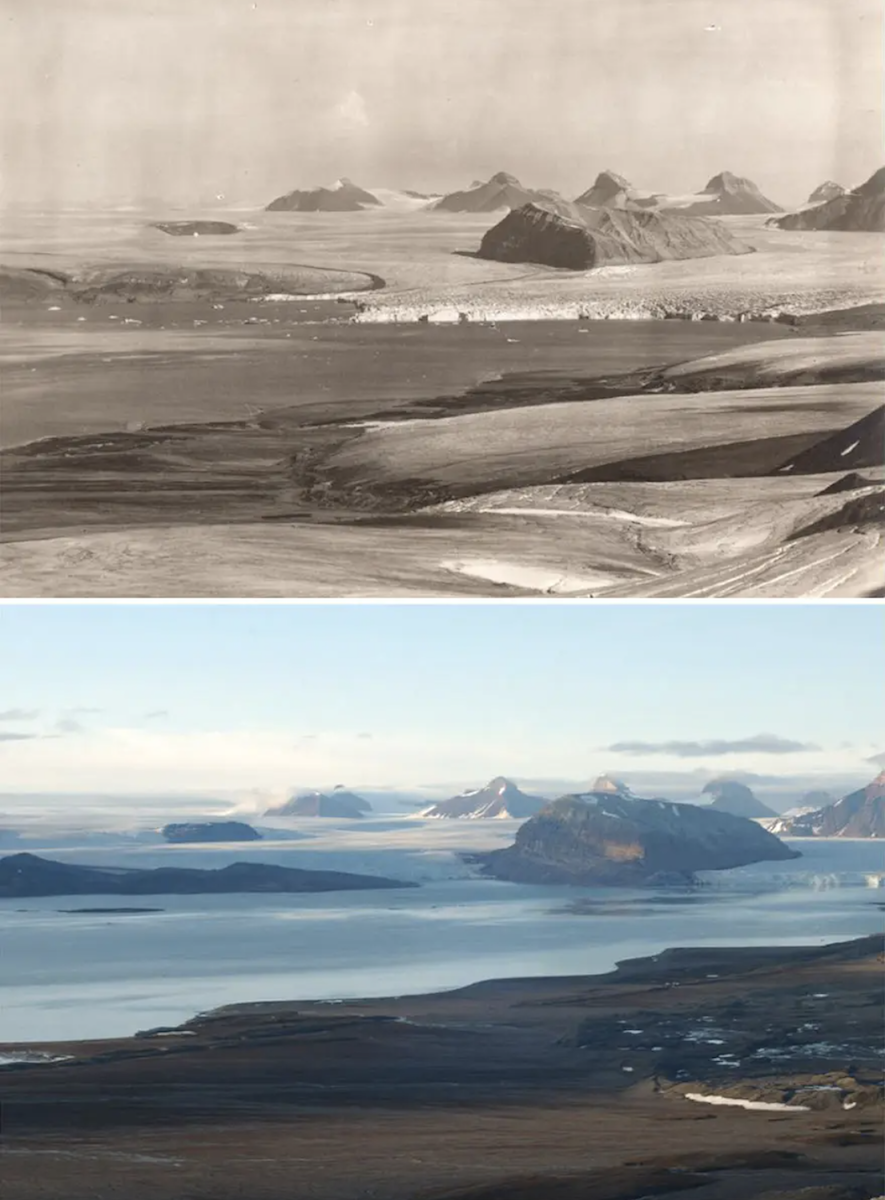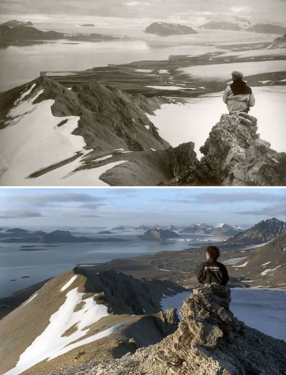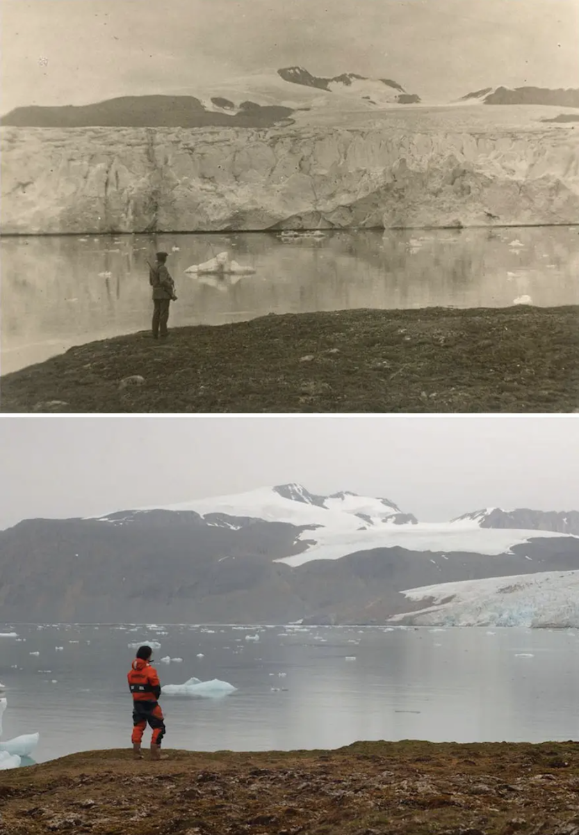Il y a un siècle, les glaciers de l’Arctique faisaient partie des plus impressionnantes merveilles de la nature. Le photo-reporter suédois Christian Åslund, qui travaille avec Greenpeace, a réuni auprès de l’Institut polaire norvégien quelques clichés de l’époque, pour montrer les modifications subies par les glaciers du Svalbard, en Norvège.
