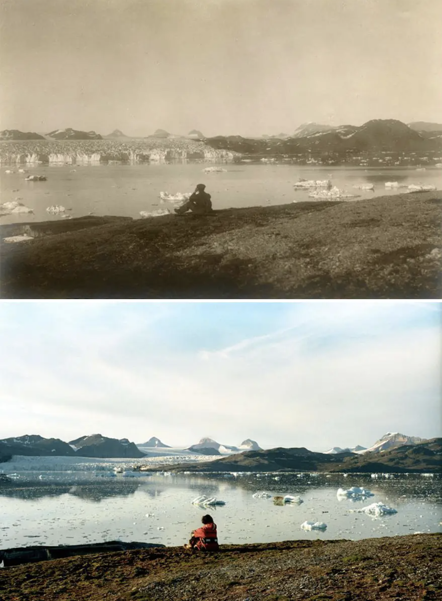 Lui-même a photographié les mêmes glaciers, 100 ans plus tard donc, et les a juxtaposés. En résulte un cri d’alarme sur la situation climatique, si ses photos datent de 2002, on ne doute pas que leur état a empiré depuis.