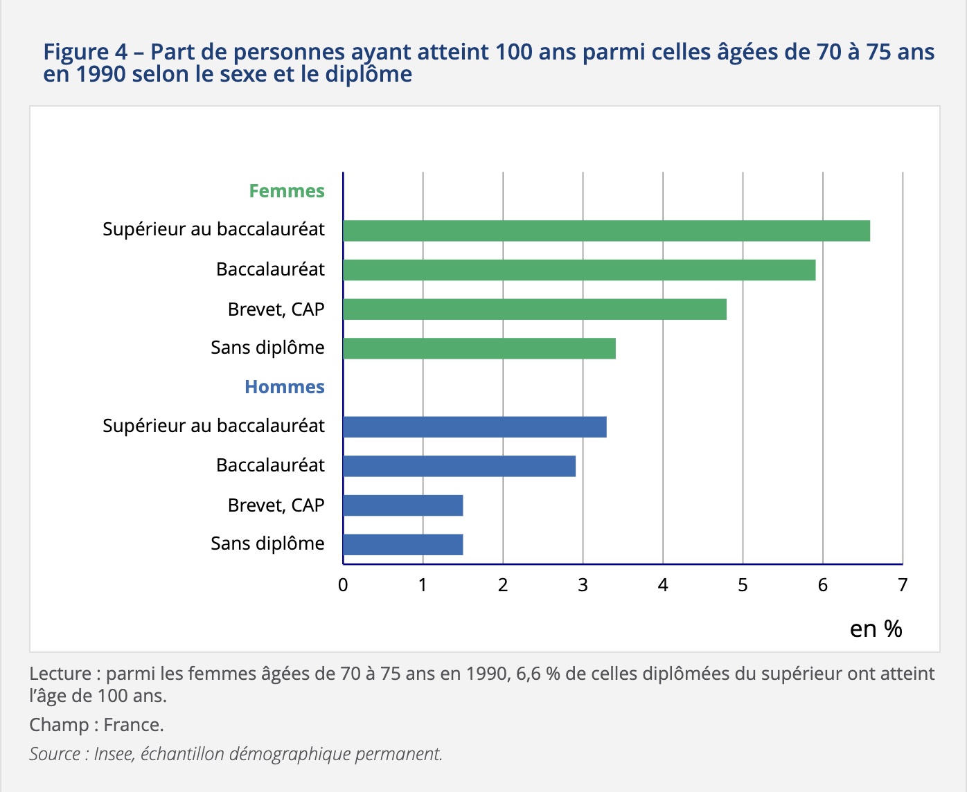 La probabilité de devenir centenaire augmente avec le niveau d’études : « parmi les femmes âgées de 70 à 75 ans en 1990, 7% des diplômées du supérieur ont atteint l’âge de 100 ans, soit deux fois plus que celles sans diplôme (3%) », affirme l’étude. Et pour les hommes, l'Insee fait le même constat : les centenaires ont été deux fois plus nombreux parmi les diplômés du supérieur (3%) que parmi les non-diplômés (1,5%)… Mais pourquoi ?