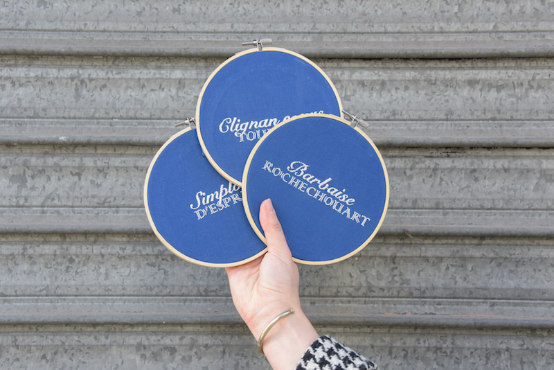 Son dernier projet en date ? Des petites broderies de 15 cm de diamètre qu’elle a appelées “les métros pas très politains” où elle détourne de façon crapuleuse (une fois n’est pas coutume) les stations de son quartier : “Saint-Georges profondes”, “Notre-Dame de levrette”… Un peu trash, un peu mignonnes, ces petites créations ne pourront que vous faire sourire !