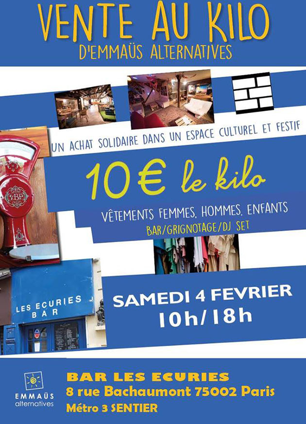 La Vente au Kilo de vêtements d'Emmaüs Alternatives revient cette fois dans un espace atypique, culturel et festif : au Bar Les Ecuries le Samedi 4 Février de 10 heures à 18 heures ! 10 euros le kilo de vêtements pour acheter solidaire !