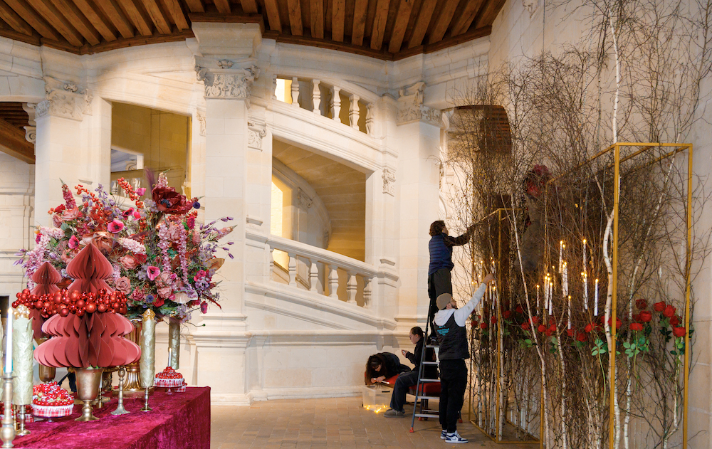 Pour les fêtes de fin d’année, l’École nationale des Fleuristes de Paris habille les différentes salles du château de décorations époustouflantes. Une quarantaine d’apprenti·e·s sont mobilisé·e·s pour cette 5e collaboration qui pendant quatre jours, se chargent de faire briller Chambord, du rez-de-chaussée au premier étage, en passant par les fameux escaliers à double-révolution. Une démarche qui leur permet de mettre en pratique leurs techniques professionnelles, tout en aménageant une installation à grande échelle. Une véritable fierté pour ces jeunes, dont certains découvrent Chambord pour la première fois ! À l'entrée du château, de gigantesques sapins et une arche monumentale ornent le porche royal.