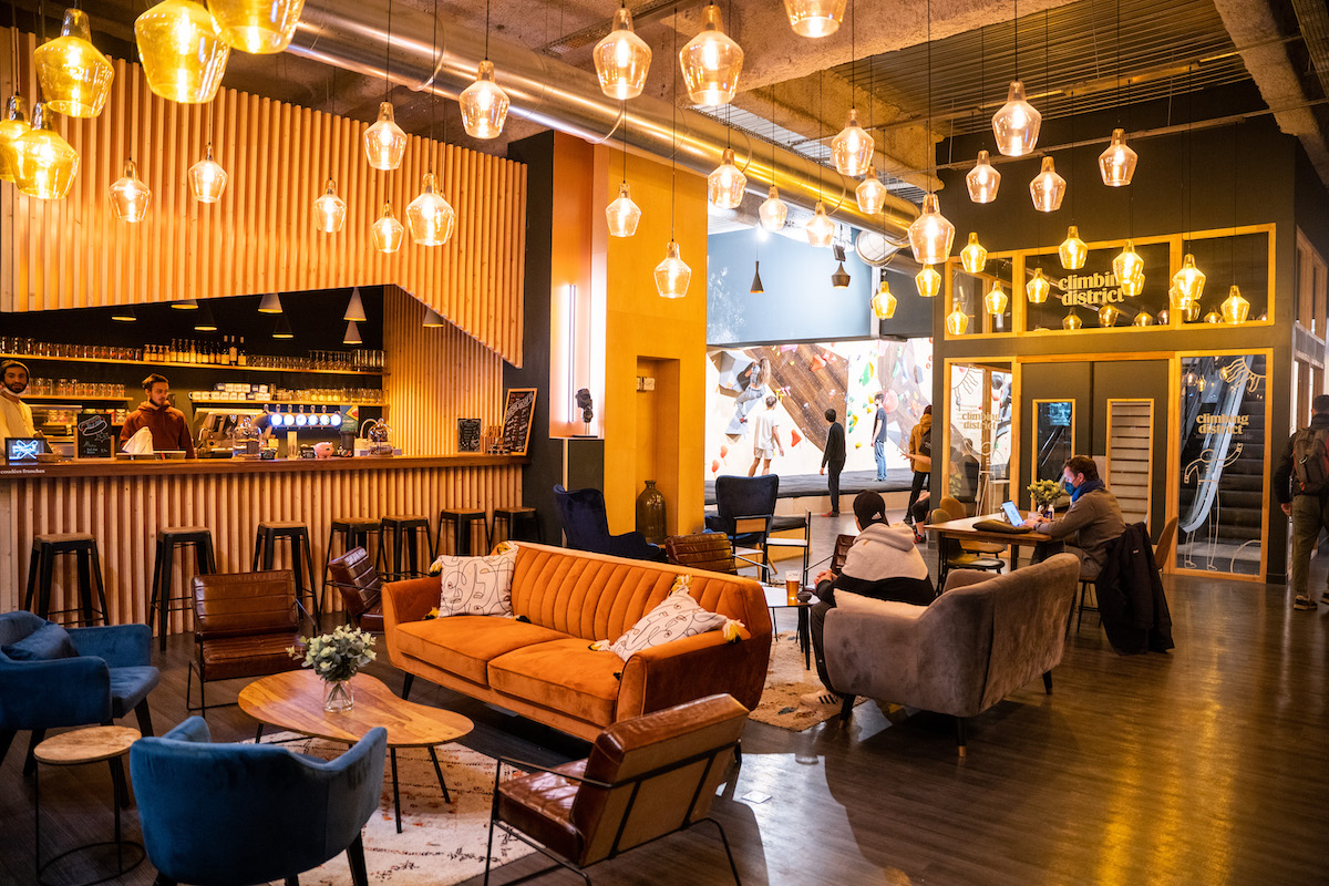 Si la première adresse dans le 17e a vu le jour en juin 2021, ce n’est que depuis novembre que l’on peut grimper dans le 19e. Et Climbing District n’est pas de ces salles où l’on vient simplement faire du sport, c’est un véritable lieu de vie. Avec son bar et sa belle proposition de snacking (planches charcut’ fromage, hots dogs) et de boissons équitables (goûtez le délicieux kombucha à la pression fait à Paris), on vient profiter de l’espace et s’installer pour coworker gratuitement en toute tranquillité dans les canapés. Pas de portique à la porte, le bel espace bien cosy est ouvert à tous ! Antoine, Benjamin et Henri, les trois amis derrière le concept, ont fait les choses jusqu’au bout en installant des petites salles pour s’isoler, télétravailler ou passer un coup de fil. « C’est l’endroit parfait pour grimper et faire tout ce que tu as besoin de faire en même temps », s’amuse Antoine.