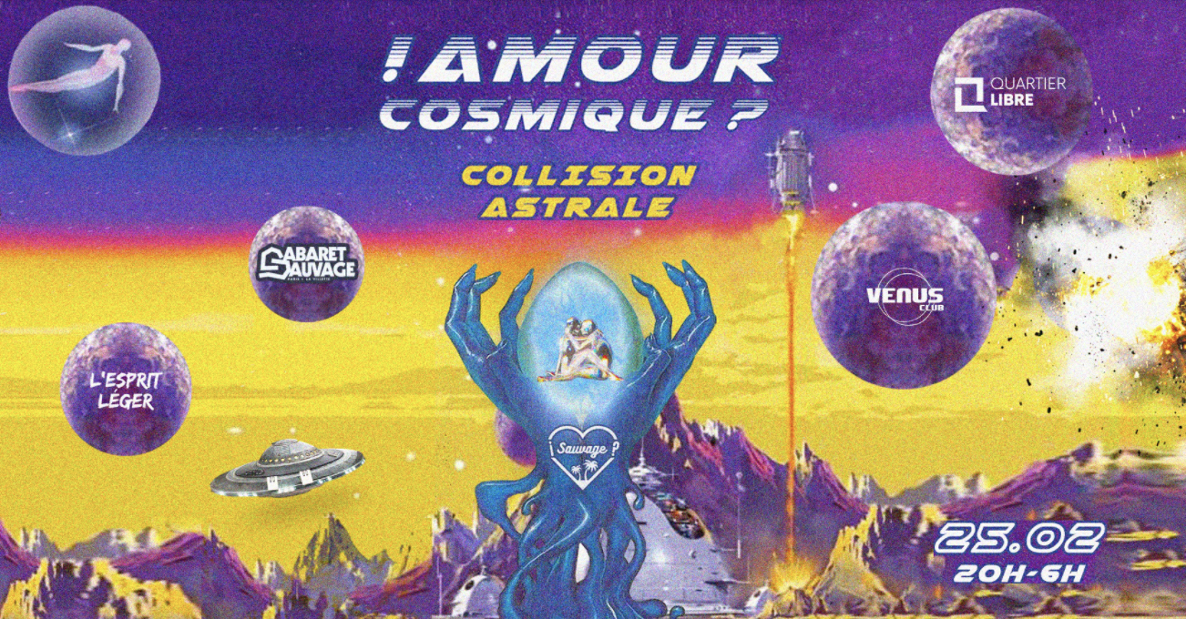 Le Cabaret Sauvage ouvre ses chakras à l'Amour Cosmique et à la Collision Astrale ce week-end. Si le concept peut vous paraître fumeux voire complètement obscur, attendez de voir le line-up. Quartier Libre, L'Esprit Léger, Vénus Club et From dark disco to techno assureront l'ambiance durant cette soirée où règneront en osmose totale amour et plénitude. Prenez vos places !