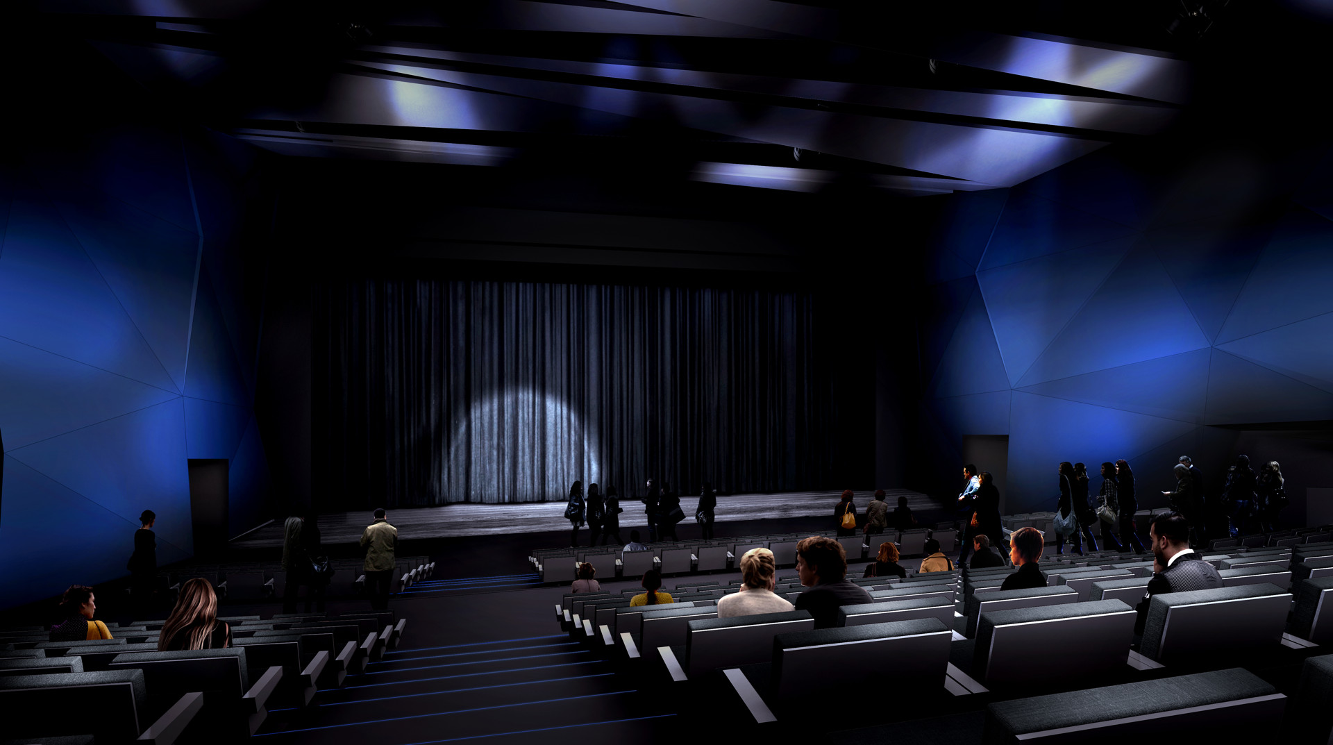 En franchissant les portes de la grande salle, on est enveloppé par l'atmosphère un peu futuriste, adoucie par les rideaux en velours noir et appuyée par les fauteuils gris et droits qui changent des lourds dossiers rouges. Vous savez, ceux qui nous emportent parfois dans les bras de Morphée lorsqu'une pièce s'éternise un peu...
