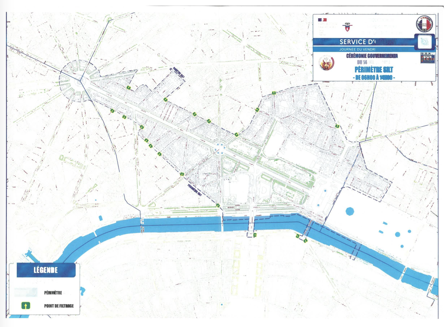La préfecture de police a également annoncé la mise en place de « dispositifs de pré-filtrage et de filtrage » pour accéder à un certain périmètre (voir carte ci-dessous). Les personnes souhaitant y accéder auront donc « l’obligation [...] de se soumettre, à la demande des agents autorisés par le présent arrêté à procéder à ces vérifications, à l’inspection visuelle des bagages et à leur fouille, ainsi qu’à des palpations de sécurité ».