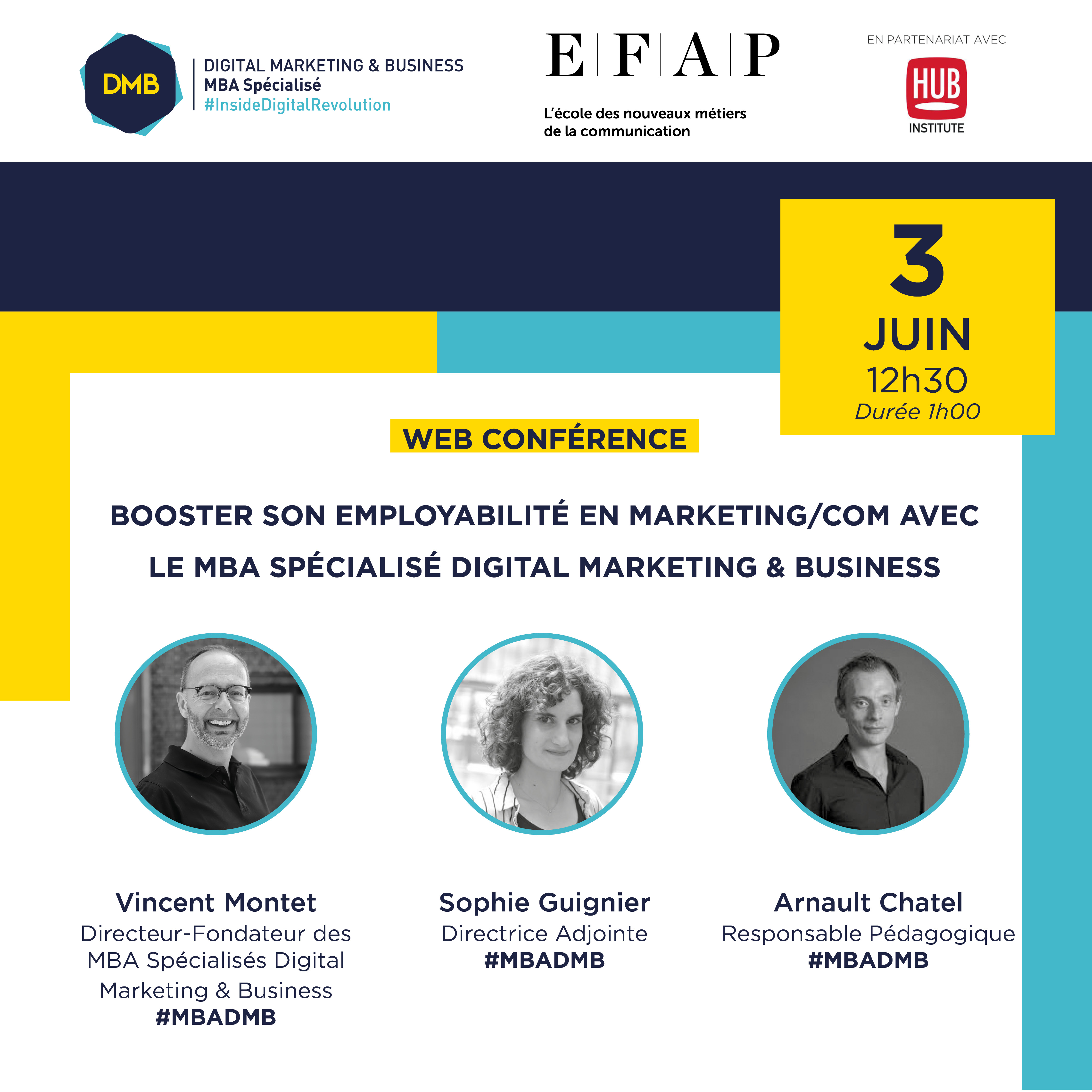 Le MBA Spécialisé Digital Marketing & Business (MBA DMB) s'est installé à Paris dans les locaux de l'EFAP (grande dame de 60 ans reconnue dans le milieu de la communication) il y a maintenant 5 ans. Fondé et dirigé par Vincent Montet, Vice-Président de l’Association de l’Économie Numérique ACSEL, il propose à tous (étudiants, salariés en reconversion, retraités en quête de modernisation) l'opportunité de devenir acteur et non plus simple spectateur de cette révolution digitale déjà en marche.