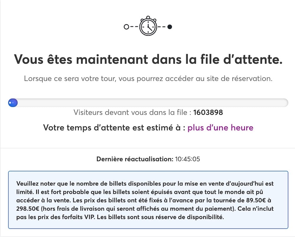La curiosité nous a piqués. Combien de gens dans le monde seraient en train d’essayer d’avoir des places pour l’une des dates de Céline Dion ce matin ? Direction la file d’attente pour avoir la réponse. Premier essai : plus d’un million de visiteurs devant nous, « votre temps d’attente est estimé à : plus d’une heure ». Sans blague. Deuxième essai sur une autre date : plus de 405 000 visiteurs devant nous. Troisième essai, même constat.