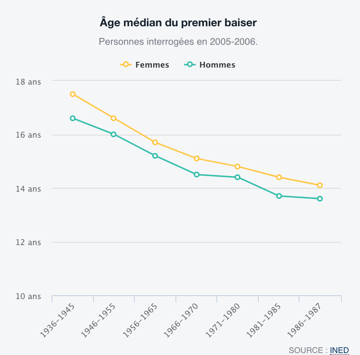 Et le bisou ? L’âge du premier roulage de pelle au fil des années baisse dramatiquement. Alors que les filles faisaient un premier baiser à l’âge de 18 ans dans les années 30 et 40, l’âge du premier bisou descend à 14 ans dans les années 80. Le tableau n’indique pas les données actuelles, mais vous pouvez nous aider à trouver la moyenne dans le sondage plus bas.