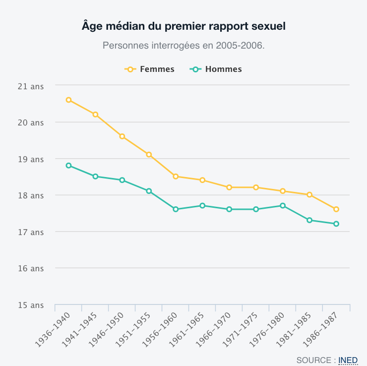 L’âge du premier rapport sexuel a également évolué vers le bas : 21 ans pour les femmes dans les années 30-40, contre 17 ans dans les années 80.