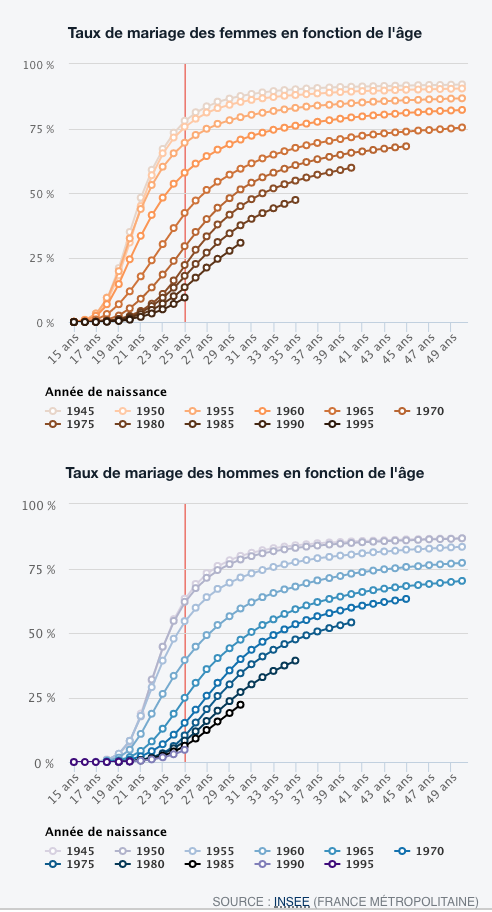 Et pour finir, le mariage est en grosse baisse de régime. Les Français se marient beaucoup plus tard qu'avant. La part des femmes mariées à 25 ans est passée de 78 à 10% en 50 ans. Pour les hommes, le taux est passé de 63 à 5%.