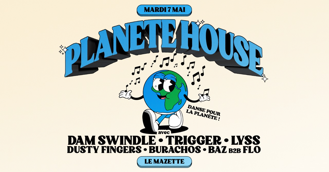 Planète House nous donne rendez-vous toute la nuit le 7 mai, veille de jour férié, sur la péniche festive du Mazette, histoire d'officialiser sa transformation. De 20h à 6h, le duo hollandais Dam Swindle, prisé par les plus grands festivals européens de musique électronique, ainsi que les artistes de la scène locale Lyss, Trigger, Burachos, Baz b2b Flo, et Dusty Fingers feront vibrer les trois dancefloors du navire. Le premier est sur le rooftop, de 20h à 00h, le second "Contre Soirée", dans la câle et la "Main Room" au niveau 0.