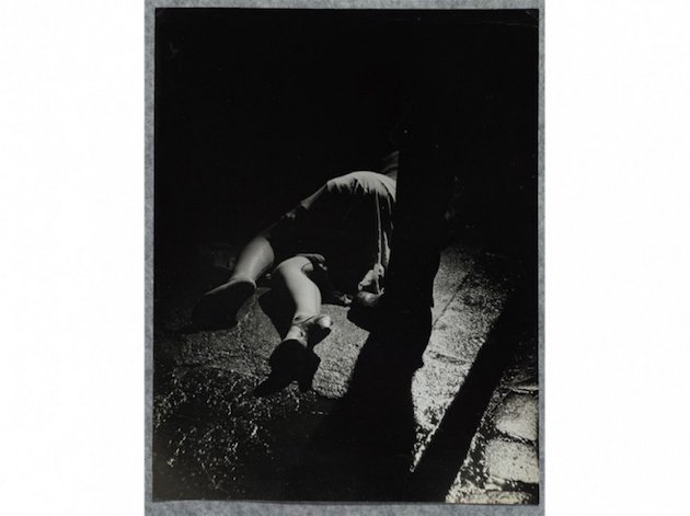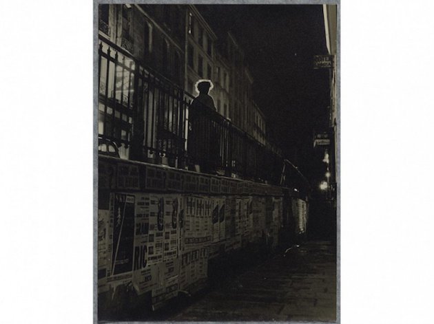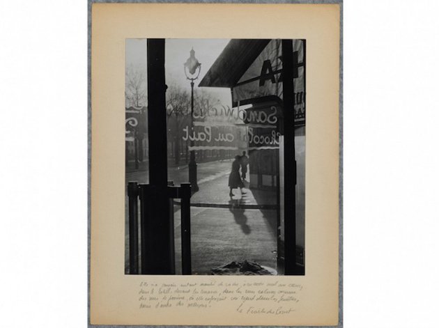 © Sans titre, Paris vers 1952, tirage argentique d’époque monté sur papier annoté, 24 x 18 cm (im.) et 32 x 25 cm. Montage par le photographe d’une citation de Simenon : « Elle n'a jamais autant marché de sa vie, à en avoir mal au cœur, dans le soleil, devant les terrasses, dans des rues calmes comme des rues de province, où elle enfonçait son regard dans les fenêtres, trous d'ombre des maisons. » (Nicolas N. Yantchevsky, BnF, Estampes et photographie)
