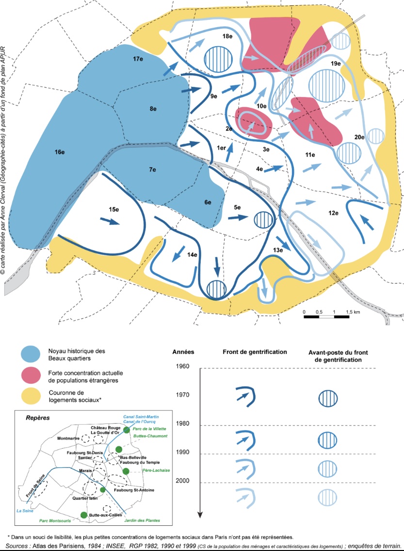 Cette répartition colle parfaitement aux cartes de la gentrification étudiées par la géographe Anne Clerval : un processus parti de l’Ouest parisien et qui diffuse lentement vers l’Est et la petite couronne. Les zones où les kebabs se concentrent sont justement ces « avant-postes » : des quartiers encore populaires mais en pleine transformation (voir la carte ci-dessous).