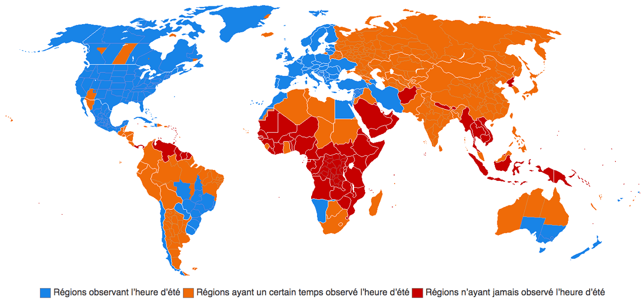 Ce changement a lieu chaque année fin octobre. La montre doit être reculée d’une heure : à 3 heures, il est 2 heures. Une heure de sommeil est gagnée. Un décalage d’une heure est observé par rapport à l’heure solaire (GMT +1).