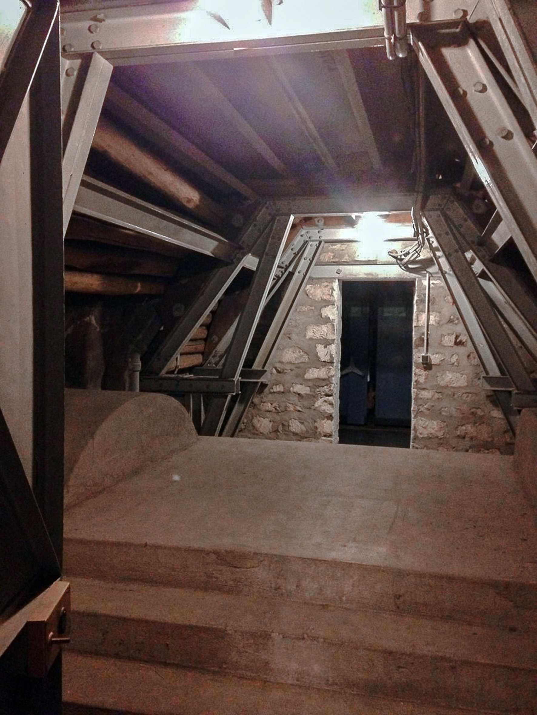 En levant les yeux, on peut encore voir les troncs d’arbre qui protégeaient l’abri d’éventuels effondrements. Aujourd’hui, ce bunker insoupçonné sert d’archives de l’hôpital et on espère bien que ce sera le cas à tout jamais.